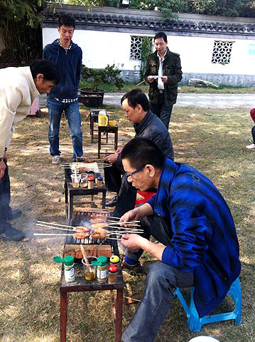 公司組織部門燒烤活動 2013-11-01 金秋十月,秋高氣爽,公司技術部全體成員攜家屬一起參加公司組織的燒烤聯歡活動。燒烤活動在美麗的太湖邊,馬山龍頭渚展開。隨后,又來到龍頭渚附近的桔灣自助采桔子,收獲頗豐。 先來張全家福 技術部2位老大,首當其沖負責給大家燒烤 滿山的桔子,認真采桔子